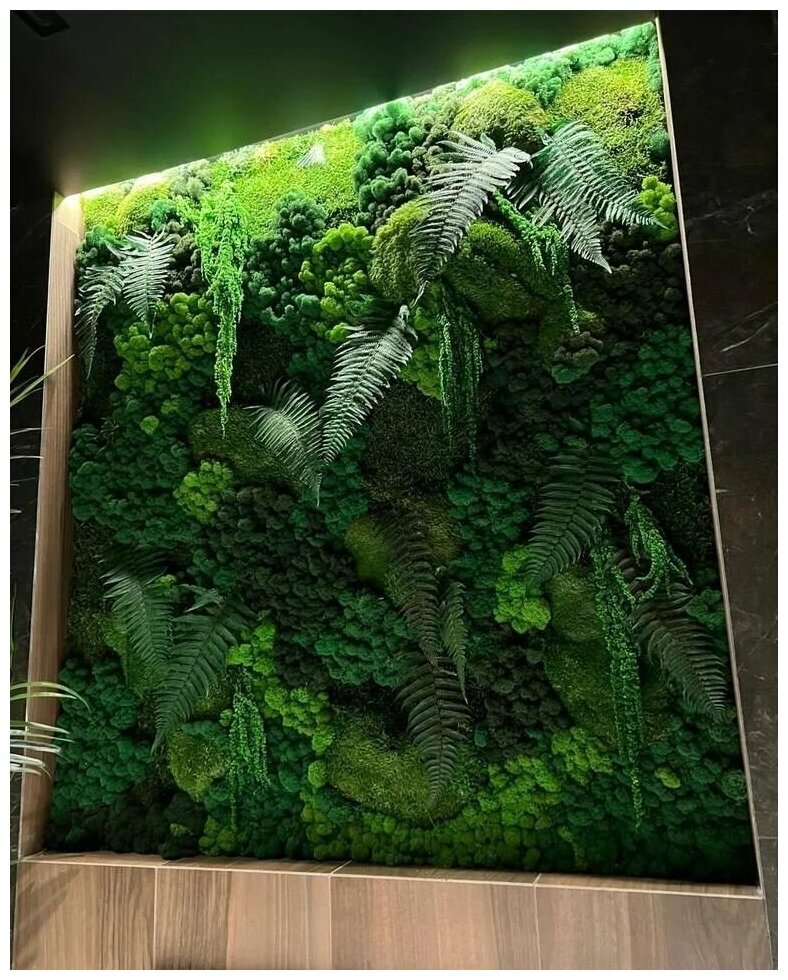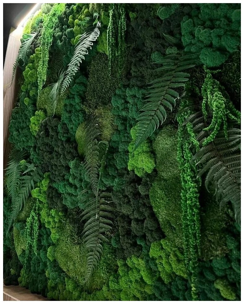 Мы производим стабилизированный мох Ягель, Кочки и Пластовой. Производство РФ, собирается в Сургуте, Казани и Сыктывкаре. Растения проходят все этапы производства, при помощи специальных составов с соблюдением сложных технологических процессов. Стабилизированные виды этих растений отличает подготовка к использованию. Она заключается в замещении всех биологических жидкостей специальным раствором, который приостанавливает все биологические процессы в растении. Такая стена из мха прослужит очень долго (5-7лет) и при этом, не изменит своего внешнего вида, а уход ей потребуется минимальный. Мох не статичен, но если он запылился, пыль можно сдуть холодным воздухом из фена.