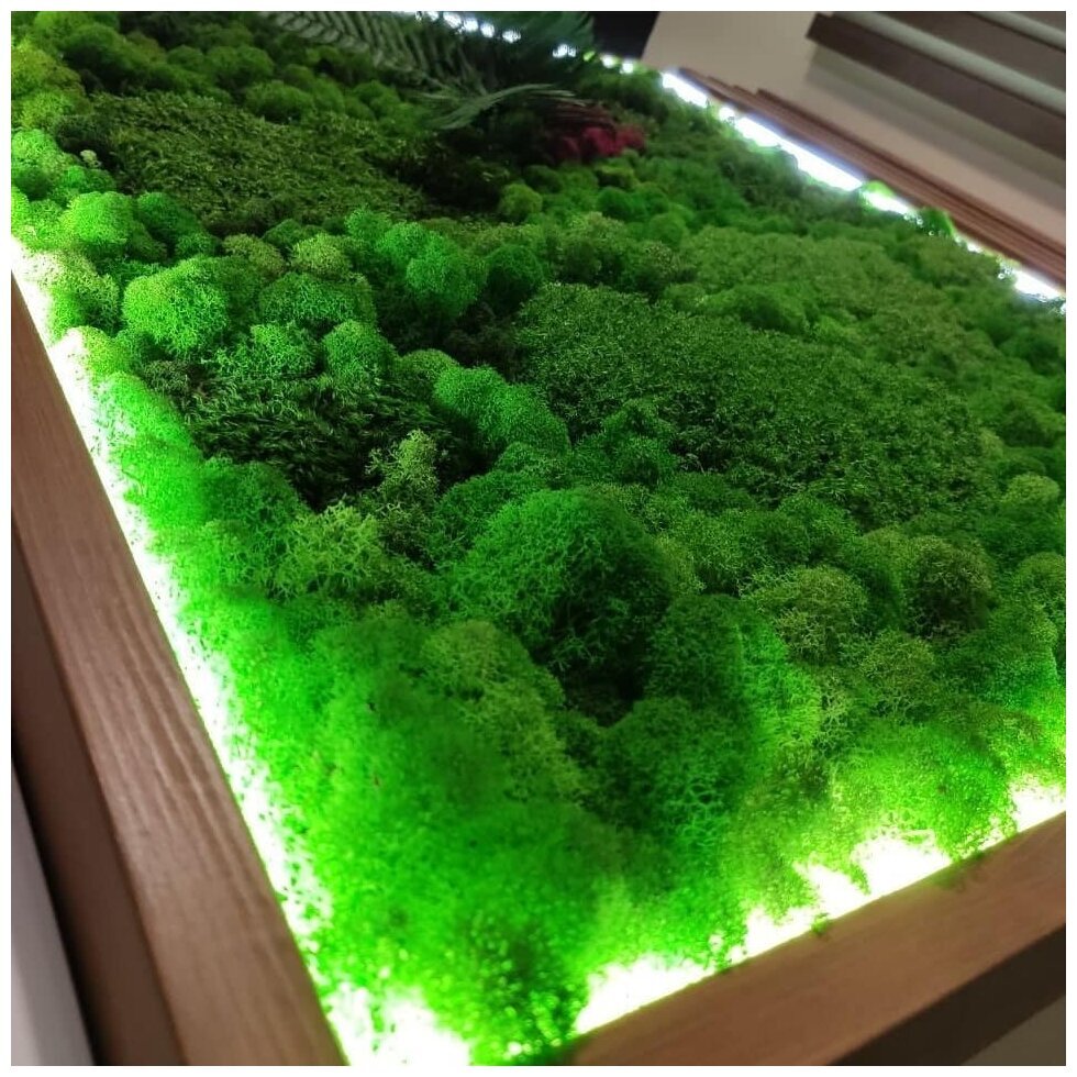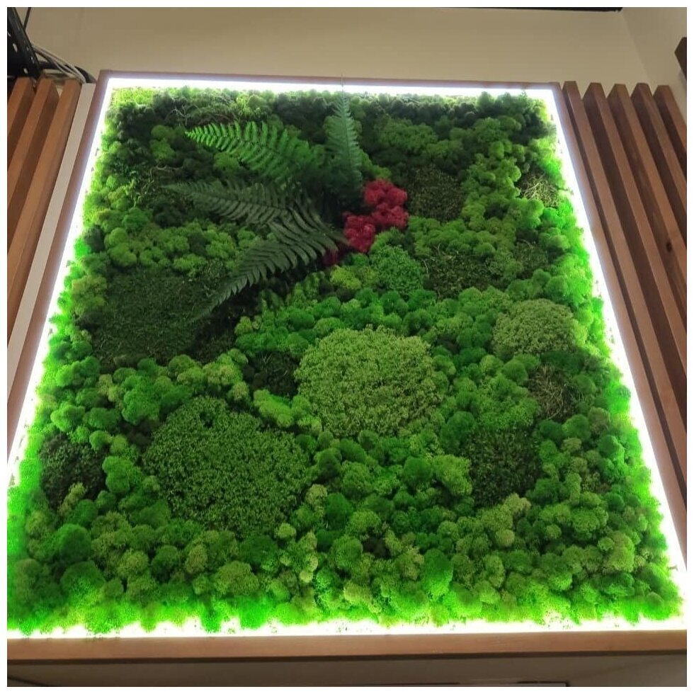 Мы производим стабилизированный мох Ягель, Кочки и Пластовой. Производство РФ, собирается в Сургуте, Казани и Сыктывкаре. Растения проходят все этапы производства, при помощи специальных составов с соблюдением сложных технологических процессов. Стабилизированные виды этих растений отличает подготовка к использованию. Она заключается в замещении всех биологических жидкостей специальным раствором, который приостанавливает все биологические процессы в растении. Такая стена из мха прослужит очень долго (5-7лет) и при этом, не изменит своего внешнего вида, а уход ей потребуется минимальный. Мох не статичен, но если он запылился, пыль можно сдуть холодным воздухом из фена.