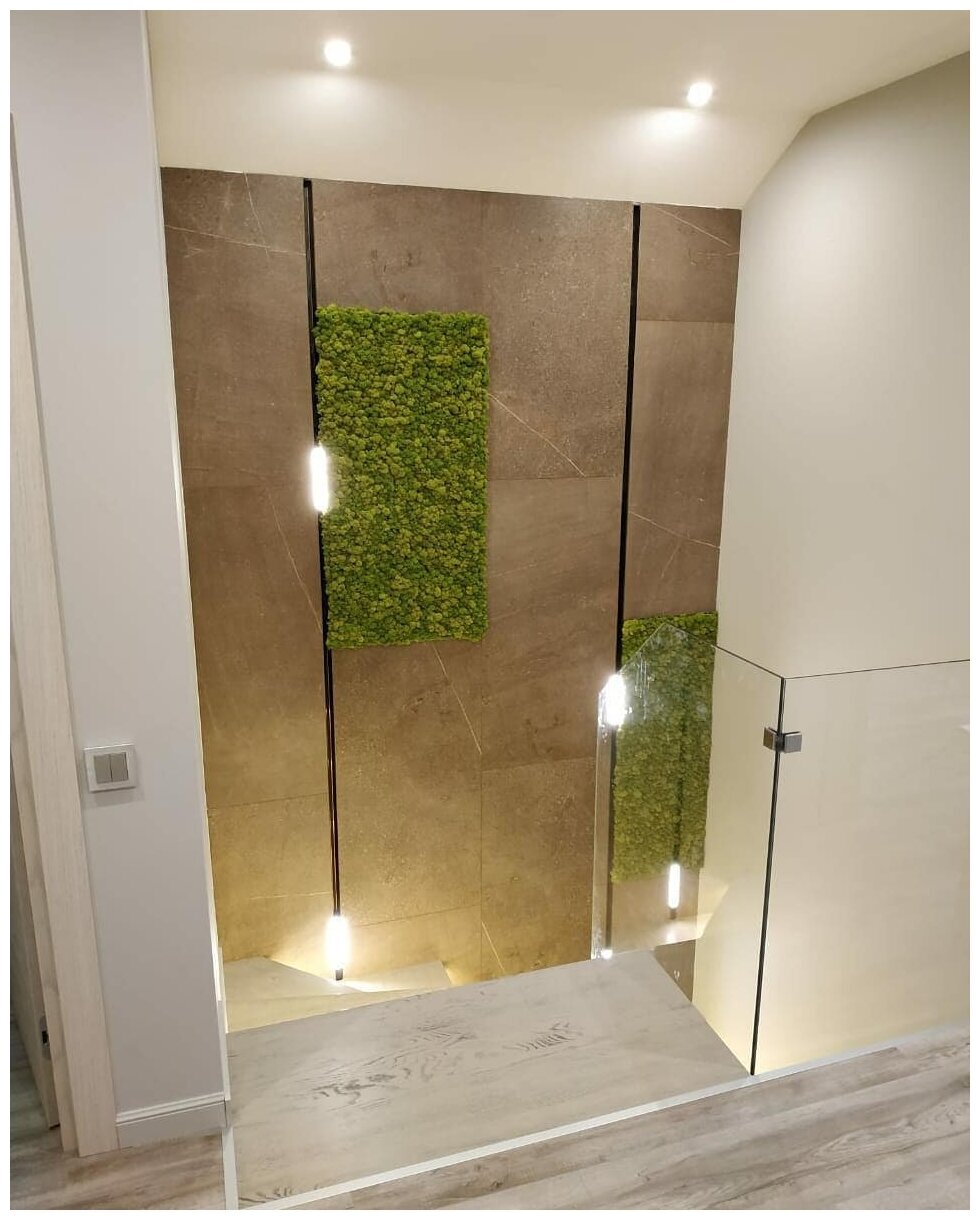 Панно из стабилизированного мха Ягель в нише. Размер панно 595х1195мм 438х1195мм. Цвет трава.